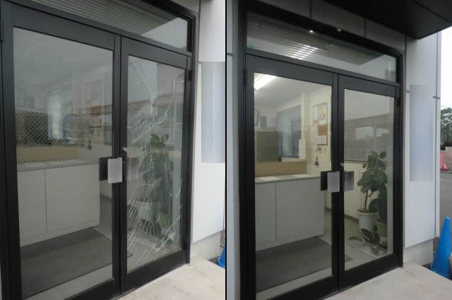 ガラスの被害はありませんでしたので、現地で框(サッシ枠)に既設のガラスを入れ替えて施工しました。